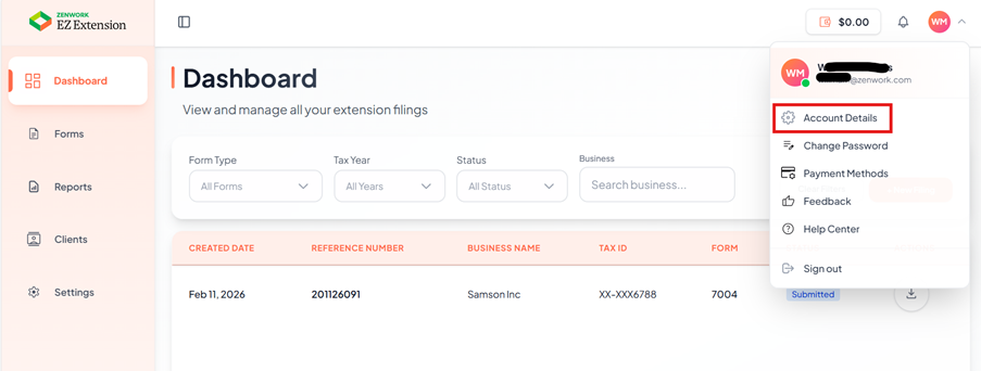 Navigate to the EZ Extension interface EZ Extension - Account Settings to access the account details.