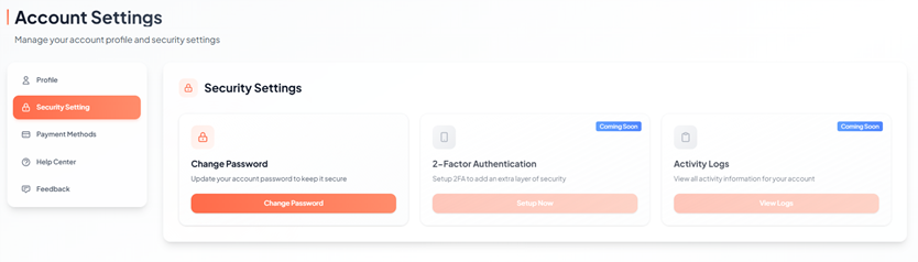 The Account Settings page appears under Security Setting section, allows you to manage your account security options such as: