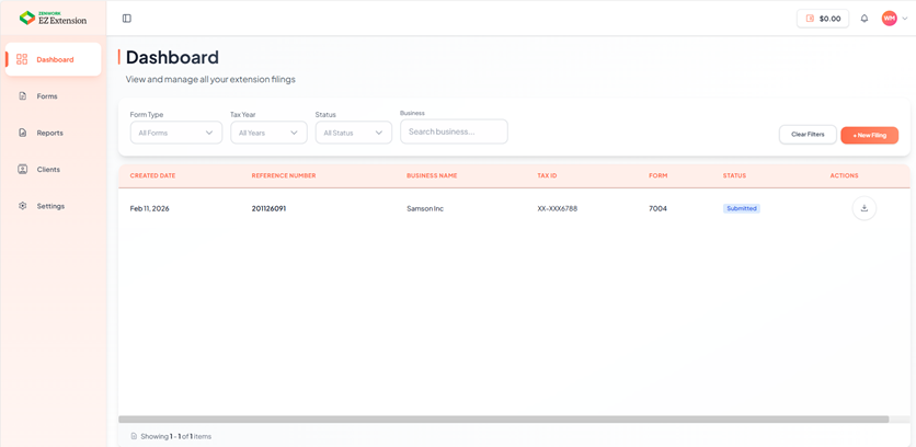 The Dashboard allows you to view and manage all your extension filings.