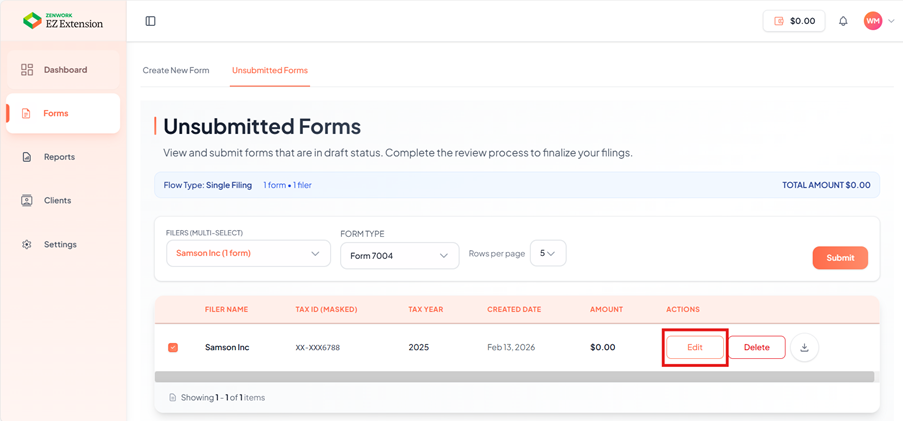 Edit a Draft Form To edit a draft form: A. Locate the form in the list. B. Click Edit icon, to edit the form. C. Update the required information. D. Click Save and Continue to Unsubmitted Forms.