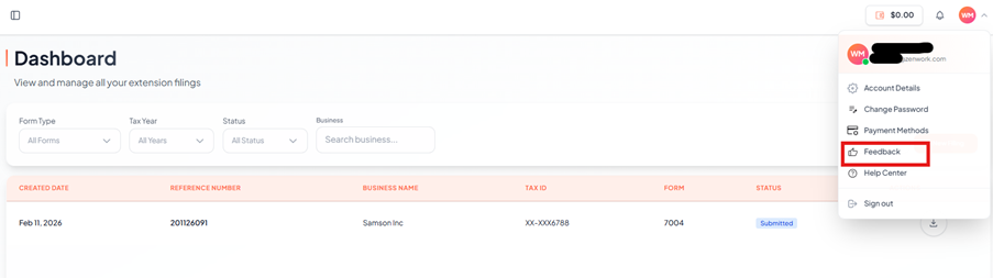 The Feedback section allows users to share their experience, suggestions, or report issues to improve the EZ Extension platform.