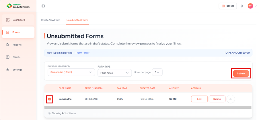Submit a Draft Form To submit a draft form to the IRS: A. Select the checkbox next to the form you want to file. B. Verify the Total Amount displayed at the top of the page. C. Click Submit.